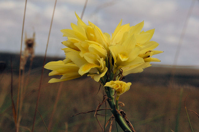 Eulophia welwitchii (Rchb.f.) Rolfe grows in grassland and marshy areas from the Eastern Cape to tropical Africa. It has stiff erect pleated leaves and pale creamy lemon to bright yellow large flowers in a dense inflorescence. The sepals and petals are not spreading. Height range: 1-3 ft. Photos 1-4 taken by Mary Sue Ittner and Bob Rutemoeller at Maclear January 2010. The first shows the habitat. The last photo was taken by Mary Sue Ittner in the bulb room at Kirstenbosch National Botanical Garden where they obviously are flowering it successfully.