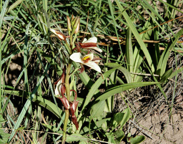 Eulophia hians Spreng. syn. Eulophia clavicornis Lindl. is a rhizomatous geophyte to 80 cm tall. It is found in grassland from the Eastern Cape to tropical Africa and is very variable in size, color of the flowers, and leaf development. It has green to purplish brown sepals and white to purple or yellow petals and lip. The flowers have fleshy lip crests with peglike outgrowths almost reaching the tip of the lip. Photos by Cameron McMaster.