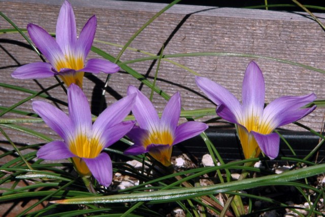 Romulea ramiflora Ten. has a rather wide distribution in Spain, Portugal, France, Italy and Greece. This species has a violet-lilac perianth with darker veins and a yellow throat. The back of the tepals are green and the upper bract has a membranous margin while the lower bract is green. The stigmas are about the same height as the stamens. Height range: 15-20 cm. Photos from Yvain Dubois who grew them from Oron Peri seed.