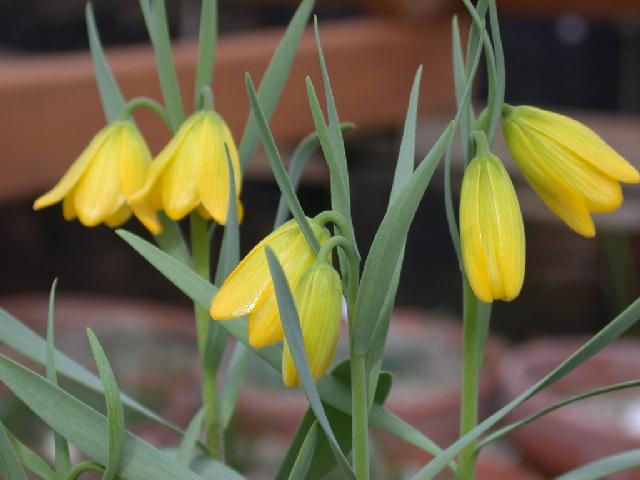 Fritillaria euboeica Rix is native to the Greek island of Evvoia and is closely related to Fritillaria carica and may be a subspecies of it. The flowers, on 5 in/12 cm stems, are large in proportion. Grown from seed purchased from Archibalds. Photos by Jane McGary and John Lonsdale.