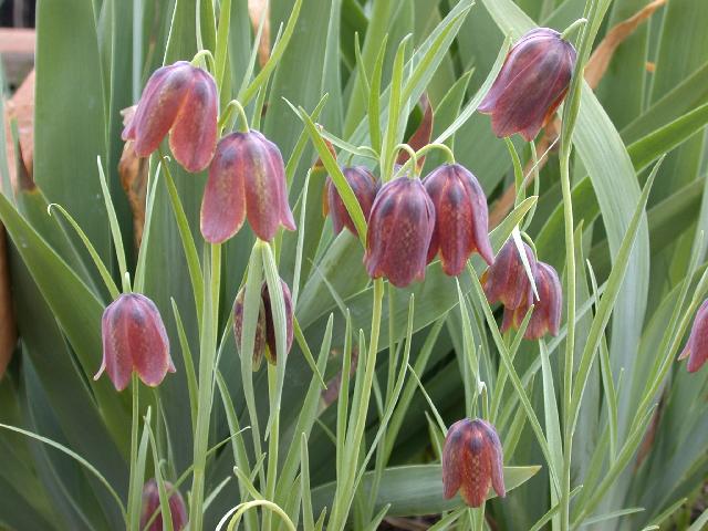 Fritillaria messanensis Raf. is a Mediterranean species with flowers that are hanging bells of chequered brown and green with a green stripe down the center of each petal. Blooming for the first time in March 2006 from seed sown in the fall of 1999. Height: about 25 cm. Photo by [Mary Sue Ittner]].