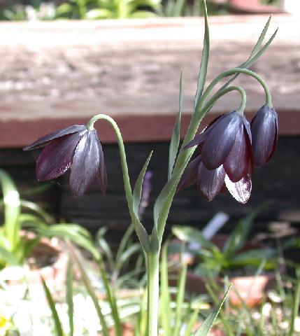 Fritillaria ehrhartii Boiss. & Orph. from the Aegean Islands of Greece, flowering in a bulb frame in Oregon in late March, showing the typical dusky purple flowers with a gray "bloom" on the outer surface and the small golden apices of the tepals. These four-year-old seedlings are in their second flowering year, an easy species to cultivate with a little overhead protection. Height: 18 cm. Photo by Jane McGary.