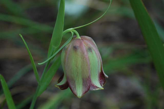 Fritillaria whittallii is from the mountains of southwest Turkey where it grows in rocky places. It grows to 20-25 cm (8-10in) and has chequered green, brown or purple-black flowers. It prefers a dry summer. Photograph by Michael J. Campbell.