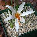 Crocus veneris Tapp. ex Poech is from Cyprus and Crete where it grows in open stony or grassy places and among scrub and in sparse woodland from 120 to 1000 m. This is a small species with white flowers with purple stripes on the outside, a yellow throat, yellow anthers, and a much divided orange style. Flowers appear with the leaves in late autumn or winter. It needs a warm and dry summer. Height: 8 cm. Photos by John Lonsdale.