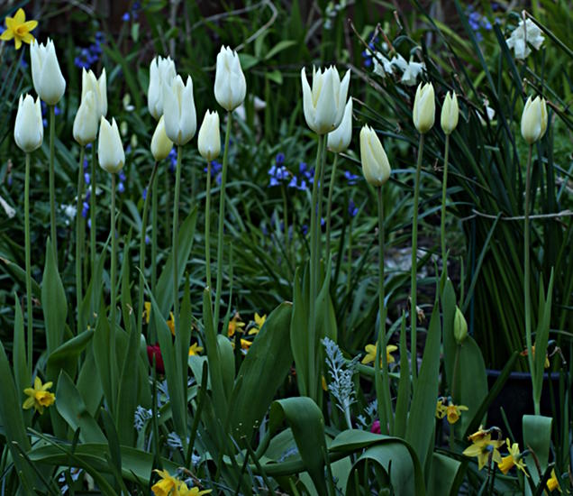 Tulipa 'Purissima' -- starts greenish cream and fades to ivory white, its massive flowers lasting for weeks if the weather is kind, and Tulipa 'White Triumphator' looks fabulous in the borders. -- John Grimshaw, Nr Cheltenham, UK.