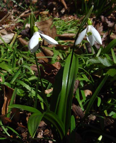 Galanthus woronowii Losinsk., named for Russian plant-collector and botanist, Georg Woronow, has broad shiny green leaves; the flowers have a single v mark. From north-east Turkey, southern Russia and Georgia, it grows 6 inches high and is similar to Galanthus ikariae. Photo taken March 2007 by Jay Yourch.