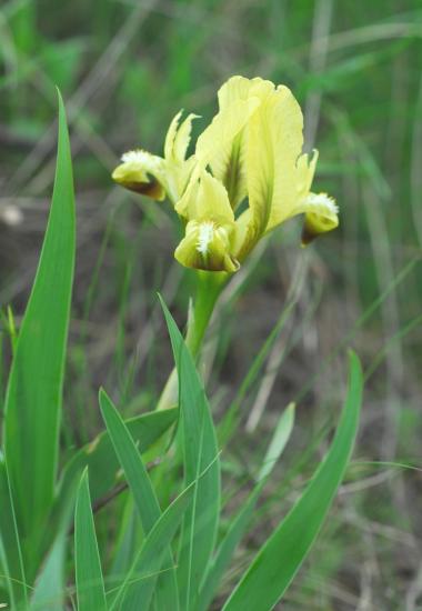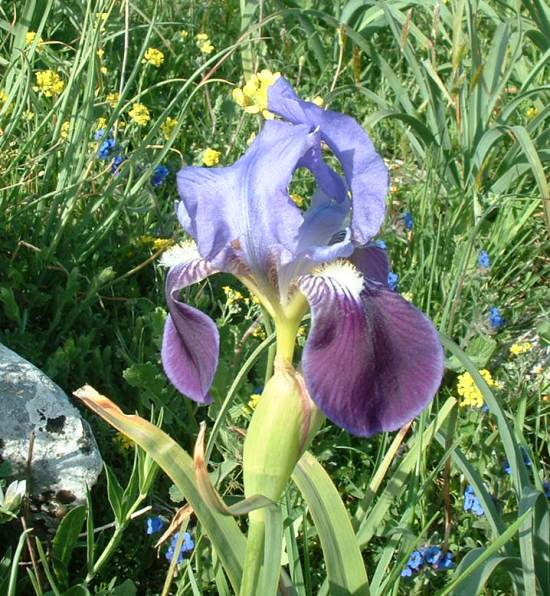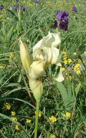 Iris pseudopumila Tineo is a dwarf bearded species, endemic of Apulia and Sicily. It is thought to be the ancestral form of all the bearded Iris. Usually yellow with brown falls, occasionally blue-violet even with intermediate specimens, it is also scentless. It grows in shallow stony soils and flowers from January to March. This single-flower species is stemless, but the long floral tube acts as stem. Photo taken in habitat in Apulia by Angelo Porcelli.