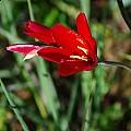 Geissorhiza inflexa (D.Delaroche) Ker Gawl. is found on clay flats and slopes in the north and southwest Cape. It can be white or cream and sometimes purple or red. Height: 12-35 cm. The red form was formerly known as v. erosa, but scientists have now discarded that name. This red one, grown from Silverhill seed, is especially beautiful. Pictures below are habitat shots. The first two were taken by Mary Sue Ittner showing a red population flowering near Tulbagh in August 2006 where it was indistinguishable from a distance from Babiana villosa which was the very same color. See habitat shots of both by looking at Babiana villosa. The next picture taken by Bob Rutemoeller near Paarl in September 2003 shows a number of white ones in flower. The last photo was taken by Cameron McMaster near Napier in the Overberg