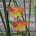 Gladiolus cardinalis x tristis. In this plant, Gladiolus cardinalis (probably a sibling of the hybrid form shown above) was crossed with Gladiolus tristis. The result was a surprisingly pale flower, marked in light red and yellow. Photo by Michael Mace.