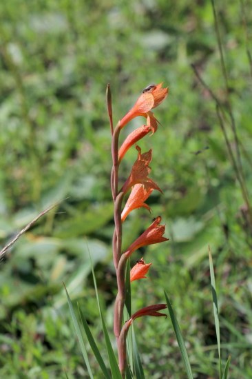 Gladiolus antholyzoides Baker, Early Afrikaner, is distributed across the central and eastern high veld of South Africa. Flowers are yellow, sometimes streaked with red or orange and with an orange ring around the throat. Height range: 60-90 cm. This species is similar to Gladiolus dalenii, but that species has a dorsal tepal that is strongly arched and conceals the anthers. This species was once included in Antholyza as Antholyza schlechteri Baker, presumably because of its long perianth tube. It has also had other Gladiolus species names. Photos from iNaturalist were taken by tjeerd near Pretoria in November and otomys in December in Mpumalanga and shared under a CC BY-NC license.