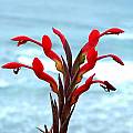 Gladiolus cunonius (Linnaeus) Gaertner (syns. Anomalesia cunonia, Antholyza cunonia) has bright red flowers and blooms in the spring and grows in sandy soils near the coast. Plants grow from 20-70 cm high. The first three photos were taken by Bob Rutemoeller and Mary Sue Ittner and the next three by Cameron McMaster in habitat near Agulhas and Arniston in the Overberg. The last picture shows the seed capsules hanging over the cliff near the ocean.