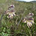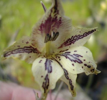 Gladiolus recurvus Linnaeus occurs in shale derived soils from Ceres to Bredasdorp and flowers from June to October depending on the elevation. The fragrant flowers are pale gray to cream, yellowish or pinkish with purple lines and dots on the lower tepals and sometimes spotted or lined in the midline on the upper tepals as well. Height: 25-35 cm. The first two photos were taken by Cameron McMaster in the Overberg. The other photos by Dirk Wallace show variation in the markings on flowers.