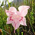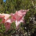 Gladiolus virgatus Goldblatt & Manning is restricted to cool, well watered slopes of the coastal ranges of the southwestern Cape. Poorly collected, it has been found in clay soil on ground covered with scattered sandstone boulders. Growing from 30 to 60 cm high, it has linear leaves with slightly thickened margins and midribs. The pale to deep pink or nearly white large unscented flowers are marked on the lower tepals with a spear shaped whitish median streak edged with a reddish v shaped mark, speckled in the throat and are in a two to four flowered inclined spike. The dorsal tepal is inclined over the stamens. This species flowers September-November. The first two photos from Rachel Saunders taken in the Helderberg Nature Reserve. The next three photos from iNaturalist taken by linkie in the same place in November and shared under a CC BY-NC license.