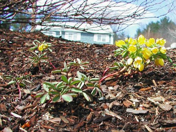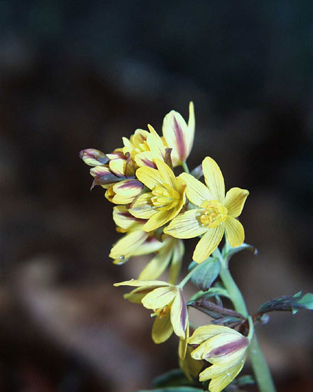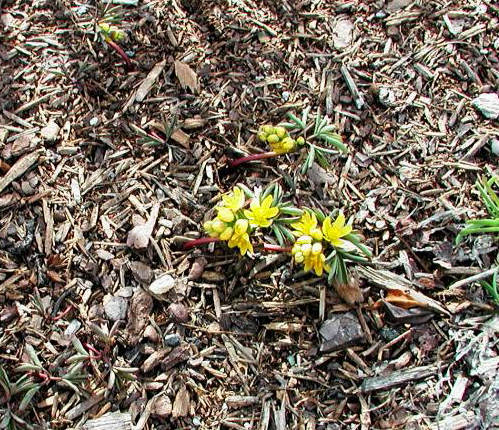 Gymnospermium altaicum - The first two views of the plant in flower were taken March & April 2003. This plant is very small and rather inconspicuous in bloom (although charming), thus it's difficult to get a good photo. The first photo was taken on March 29, 2003, showing the red, sideways-emerging stems that are less than 2" (5 cm) tall, and small bright yellow flowers. The plant and flowers were unharmed after a week and a half of ice, hail, snow, and pouring rain. The second photo is a worm's-eye view of the dainty flowers that are best observed up close. The last photo was taken spring 2002 of the foliage and spent flower stalks. Photos by Mark McDonough.