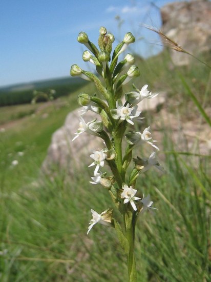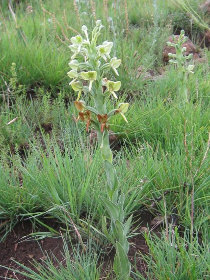 Habenaria laevigata Lindl. is a tuberous orchid found on stony grassland from 700 to 2000 m in the Eastern Cape of South Africa. It grows to 40 cm and has leaves that clasp the stem and green scented flowers in a dense inflorescence. It blooms late spring into summer. Photos taken by Cameron McMaster, Bob Rutemoeller, and Mary Sue Ittner January 2010 at Maclear and Naude's Nek.