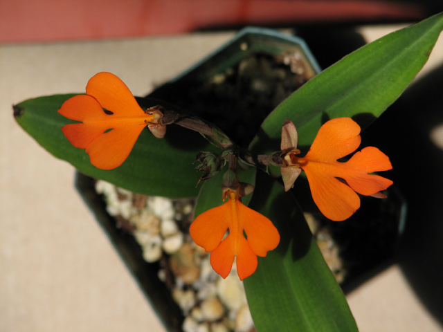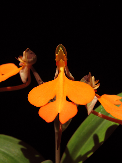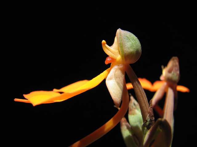 Habenaria rhodocheila Hance is native to a broad geographic range from southern China to Malaysia and the Philippines. There are several color forms. After flowering, it enters a dormant stage, where the tubers must remain in a state between moist and dry. When new shoots appear, increase watering to keep the medium just moist until vigorous growth commences. Height range: 30-60 cm. Photos 1-5 were taken by Nhu Nguyen. Photo 4 shows the side view that includes the stigmatic surface. Photo 6 shows a pollinium.