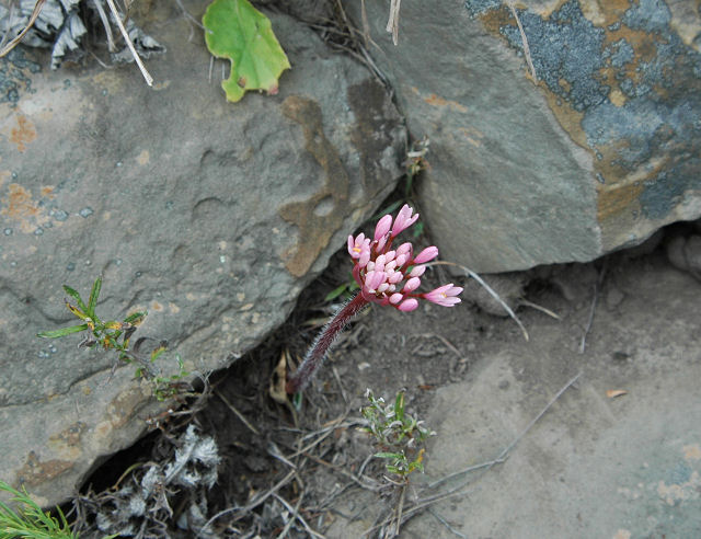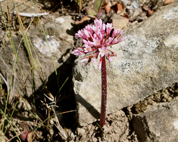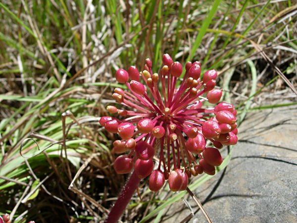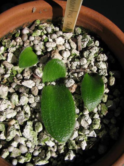 Haemanthus carneus Ker Gawl. is an extremely rare species that is only found in the Somerset East area of the Eastern Cape in Acacia thicket and grassland. It is distinguished by a looser, widely spreading umbel and stamens included well within the perianth, the only known Haemanthus with this feature. It has the same growth pattern as Haemanthus humilis in the wild with leaves emerging just after the flowers (January to March) and persisting to late spring. Height: about 10 cm. Even though these come from summer rainfall areas, they come from high areas from 1000-2000 meters. In cultivation, it seems that they want to grow in the winter in the northern hemisphere (even from seeds). Plants are easy to grow if kept pot-bound and in part shade. Mature plants are happy and will flower in a 4" pot, according to Dylan Hannon. Plants sown from seeds will flower in 4 years.