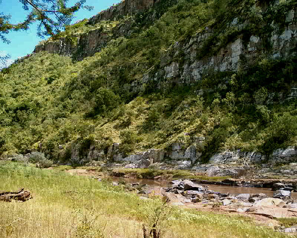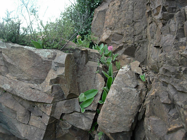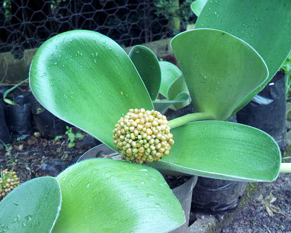 'Giant' form -- named as such by Cameron McMaster because of the spectacular leaves up to 60 cm in diameter and it has an enormous flower head. This form was first discovered when Cameron observed them with binoculars growing on a steep cliff in full shade on the opposite bank of the Great Kei River. Photos by Cameron McMaster show the habitat, the flowers, the leaves, and the fruit.