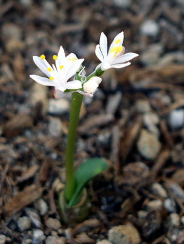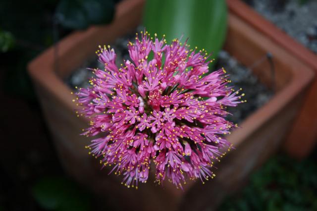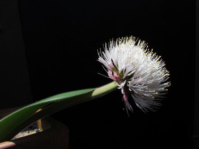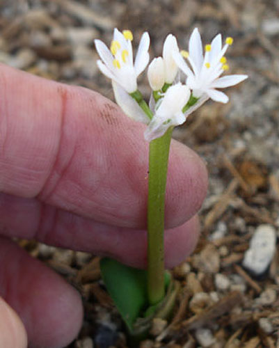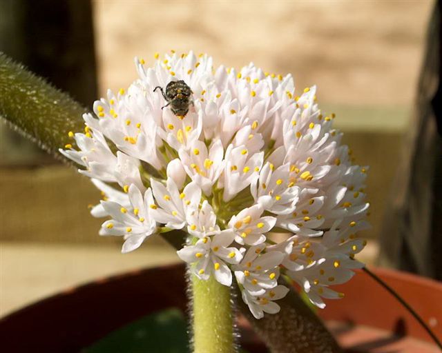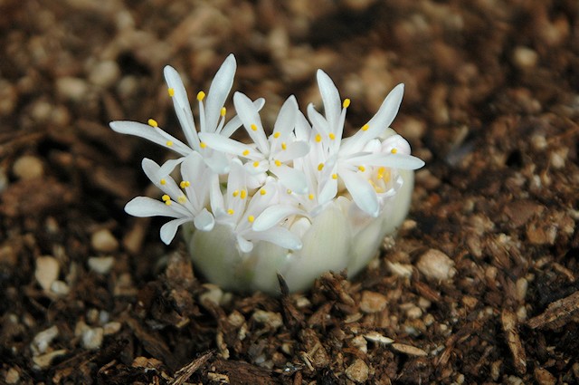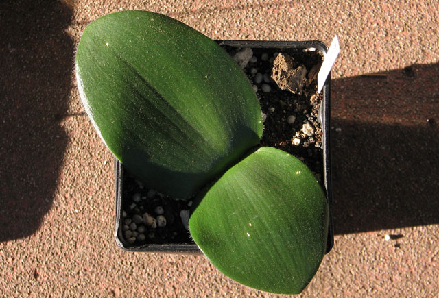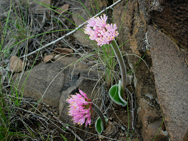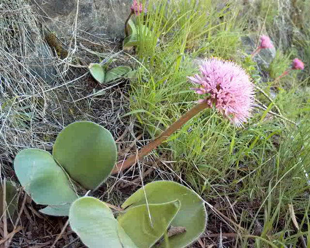 'Dwarf' form 2 -- was received by Doug Westfall as Haemanthus carneus but it was identified as a miniature form of H. humilis because the stamens appear to be exserted, which excludes it from being a white form of H. carneus.