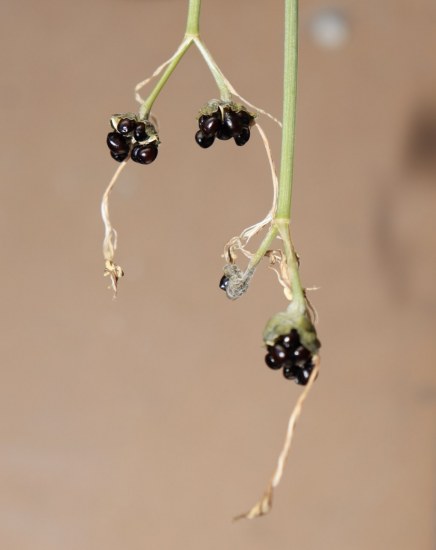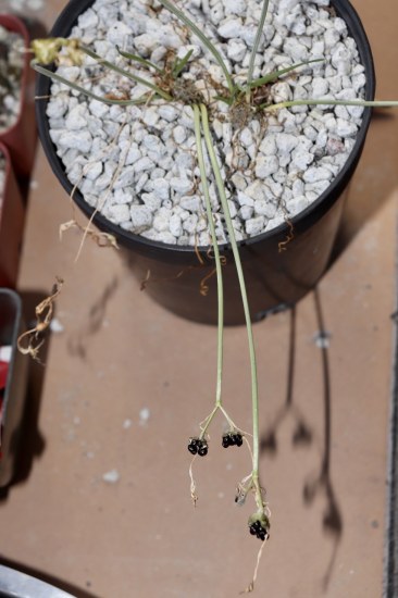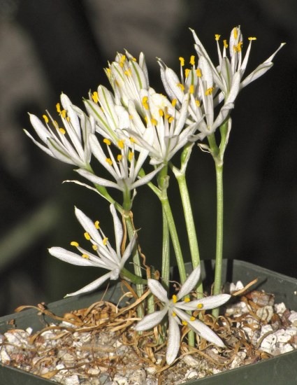 Hannonia hesperidum is confined to Western Morocco, Promontory of Hercules. The specific name comes from greek hesperos, of evening, as the flowers open in the late afternoon. The bulbs are 20-25x20 mm., with brown papery tunics; they have a long neck about 4 cm long. The species is hysteranthous. The stem is about 10 cm high, 2-edged, a little twisted. The pedicel is 1 cm, green; the perianth has a short green tube, 5 mm, spreading in six white elements, 15 mm long and 2.5 mm wide, linear-lanceolate a bit broadened below the apex, and with a green line externally. The stamens in two orders, 3 equaling the tepals, 3 shorter; anthers yellow; style white and terete. The leaves are just 2 mm wide and 20 cm long. Flowering period: late summer. Each flower lasts just one day. No scent. Grows in rock-fissures, a very sandy-gritty soil is needed in cultivation. No water in summer and very little in winter. In areas which experience frost a frost-free bulbframe or a greenhouse have to be used. Full sun. Photos by Alberto Grossi, 27 of August 2007.