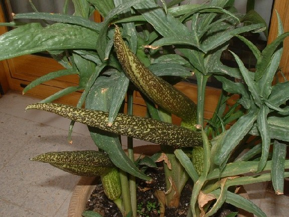 The species, Helicodiceros muscivorus (L.f.) Engl., is endemic to Sardinia, Corsica, and the Balearic islands, dwelling on seashore habitats. Cultivation is easy in a Mediterranean climate, but, if you want to hold your reputation as a sane person, don't be so proud as to show it to your friends! Plants grow to about 30 cm. Photos below by Diana Chapman and Angelo Porcelli of flowers and leaves.