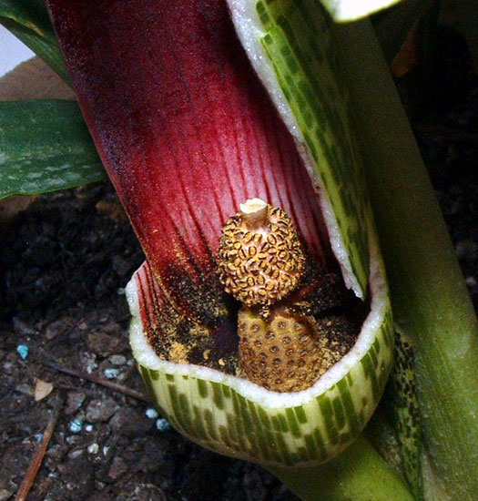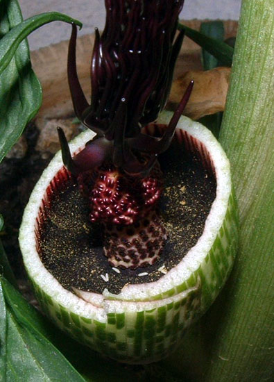 Photos and text by Angelo Porcelli describe the interesting pollination strategy. The first day of blooming only the female flowers are receptive, and their peak, which is about midday, is linked to the strong emission of a smell like rotting shellfish. The spathe won't unroll if the day is cloudy. Rather it waits until a warm and sunny day so that the smell can spread far and wide. Flies come from everywhere, invited to a macabre party. They wander around until they find the way to pass through the constriction, following the hairy spadix. At this point, they won't be able to get out of the enclosure at the base of the spathe and stay trapped for the whole day. The following day the male flowers are fertile, shedding pollen, and the female ones are already inactive. This is when the plant loosens the constriction, allowing the flies, well dusted with pollen, to escape - only to be trapped again in another plant, ensuring cross-pollination.