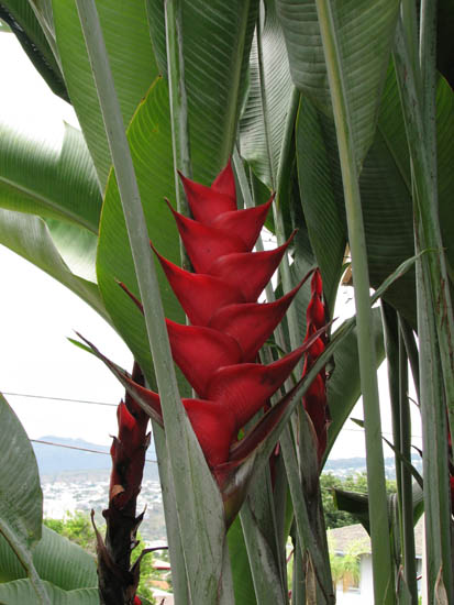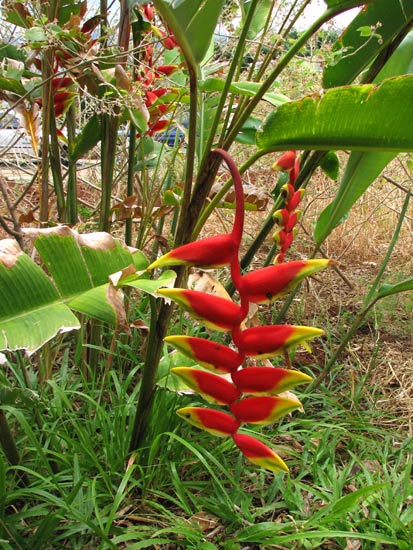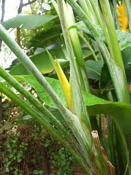 Heliconia caribaea Lam. grows in a dense clump about 8-10 feet (2.5-3 m) and once mature can produce numerous inflorescences. This species comes in several forms. Plants pictured below are grown by Uluwehi Knecht. Photos 1-2 were taken by Nhu Nguyen of the red form. Photos 3-5 were taken by Uluwehi Knecht of the yellow form showing the whole plant and various developmental stages of the inflorescence.
