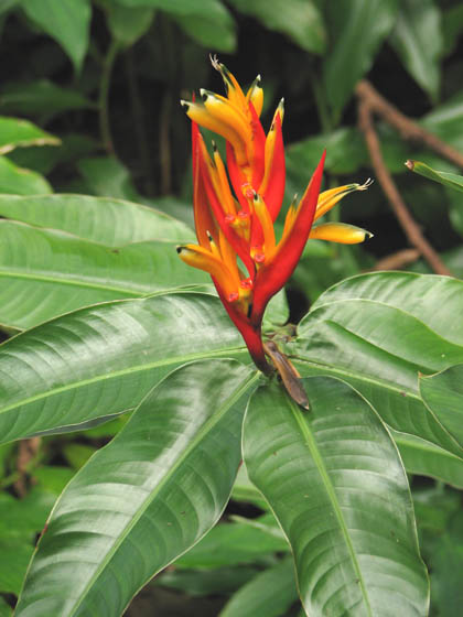 Heliconia is the only genus of the family Heliconiaceae. There are varying estimates of species number that range from 100-250. Most occur in tropical America but a few species occur on islands in the Pacific. Plants are rhizomatous with a pronounced pseudostem and broad leaves. Size of plants vary depending on species and could range from approximately 30 cm to several meters tall. Two basic types of inflorescences developed during the evolution of these plants: the upright and pendent forms. Pollination is either by birds (the Americas) or bats (Pacific). Bird pollinated flowers tend to have very brightly colored bracts whereas bat pollinated flowers tend to be rather dull, oftentimes a light shade of green. Heliconias require warm temperatures, soil rich in humus, lots of water, and fertilizers with plenty of potassium. Propagation is by rhizomes and seeds. Some species respond well to rhizome division whereas others do not. Divisions of rhizomes are most successful when 2-3 mature pseudostems are attached (pseudostems should be cut off before repotting). Precaution should be taken to prevent pathogenic fungal infections. Seed germination can take anywhere from 2 weeks to over a year, depending on the species. Bottom heat aids in successful propagation. In cultivation, some species spread quickly by rhizomes and in some cases can be invasive. Others form tight clumps and are slow-growing.