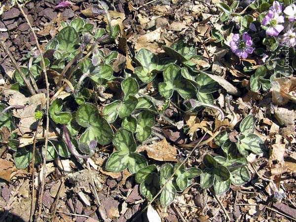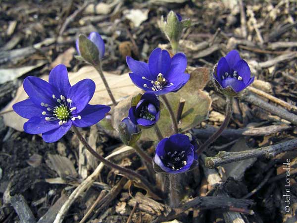 Hepatica nobilis Mill. has a wide distribution and is found in Europe, Asia, Russia and eastern North America. It has glossy green or sometimes marbled leaves that are purple underneath. Flowers with 6 to 7 showy sepals are mostly blue, but there are white and pink flowers found in the wild and many cultivars being grown. This is the one species some claim to be a bulb, because it has a short thick, rhizomatous rootstock. Height range: 7-15 cm. Photos by John Lonsdale.