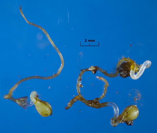 Seed is not viable for long if stored dry. It is common to find it sold fresh for immediate sowing at the start of summer. A temperature cycle is required; a root emerges on the transition from summer to fall temperatures and the first leaves will appear the following spring. Photographs by David Pilling of seed (first on a 10 mm grid) and germinating seed in mid-winter. I obtained a large amount of seed from the surplus distributions of the Alpine Garden Society and Scottish Rock Garden Club seed exchanges; in other words, seed that had dried out. I kept it in zip-lock bags with moist kitchen paper and it germinated after a year. An anecdote which may indicate a modest fraction of seed is viable after dry storage, but needs a complete annual temperature cycle to germinate. Photo 4 shows seed forming and in photo 5 taken six weeks later, it is almost ripe. Photo 6 after another couple of weeks shows ripe seed; it turns brown later; a millimetre scale is visible.