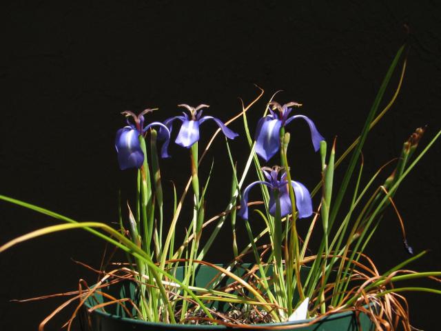 Herbertia lahue (Molina) Goldblatt has three subspecies. Two of the subspecies are from dry areas in Chile and Argentina and bloom in the spring. It prefers full sun, neutral to alkaline well drained soils and is dormant in summer. This species is often offered in seed exchanges under the wrong name (as Alophia drummondii and Herbertia pulchella for example.) It blooms into summer so even though the flowers only are open for a day, new ones appear over a long time. Height range: 10-25 cm. Photos were taken by Mary Sue Ittner of plants grown from seed. Although she no longer grows this species in a pot, every now and then she sees one appear in the ground as illustrated in the last photo.