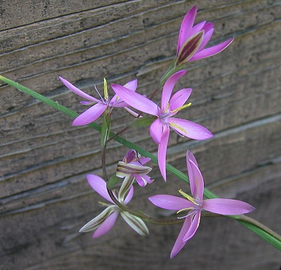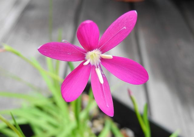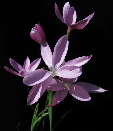 Hesperantha oligantha (Diels) Goldblatt grows in stream banks and marshy ground in the Roggeveld. Plants grow from 6 to 10 cm high with linear to falcate leaves. The flowers are open during the day and unscented, bright pink to purple with a white throat. Flowering time is early spring, September to October. The first five photos below were taken by Mary Sue Ittner of plants grown from seed blooming the first time, February 2014. Sixth photo is by Gordon Summerfield.