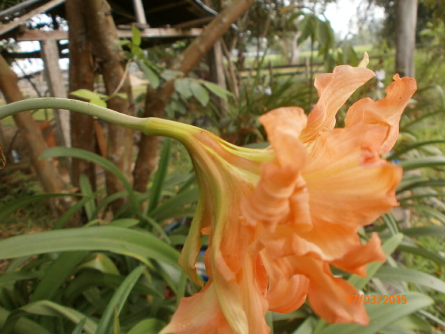 Hippeastrum psittacinum (Ker Gawl.) Herb. is a species from Brazil that grows to about 60 cm. This plant was grown from seed by grower Chris Underhill in NSW Australia, who received seed from South America. There are many cultivars of this species and he may have grown it from 'Atibaia' Allan Ladd took these photos on 13th September 2013 of the flower and the whole plant growing in his garden. Atibaia is a town in the southeast of Brazil, near São Paulo. The species is native to eastern and southern Brazil; psittacine means resembling a parrot.