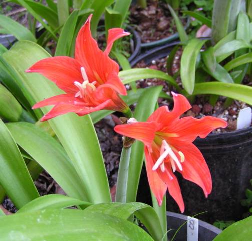 Hippeastrum reginae (L.) Herb. is a widespread species in South America. Height range: 30-60 cm. Photos 1-3 were taken August 2005 in southern Brazil by Tarcísio Eduardo Raduenz. Photos 4-6 were taken by Nhu Nguyen of seed-grown plants.