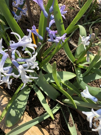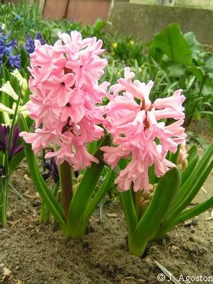 Hyacinthus orientalis cultivars come with single or multiple stems, single or double flowers, and are white to cream, pink, blue to purple and densely to loosely packed. Honeybees and bumblebees like the fragrant single flowered varieties. See a video of honeybees visiting a white form and a blue form by Travis Owen (or see in-line videos below). Photos below taken by Janos Agoston of named cultivars: