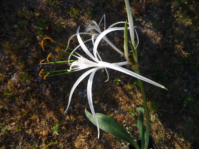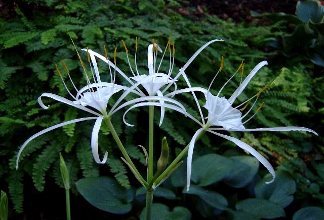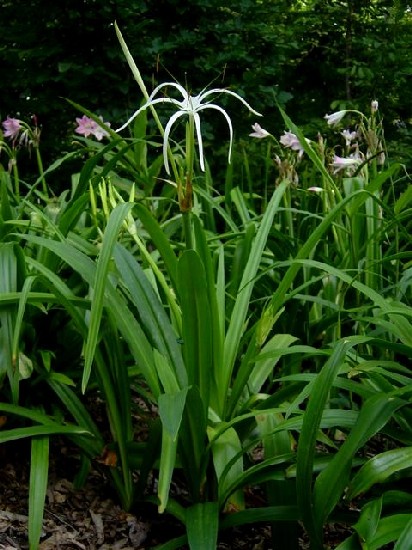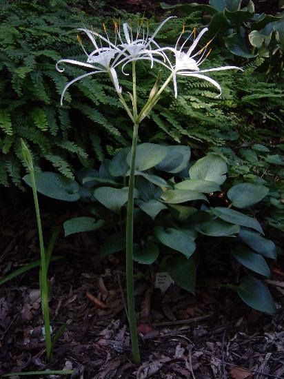 Hymenocallis occidentalis (Leconte) Kunth is native to the Eastern United States and blooms in late summer. Depending on the plant and the growing environment, the leaves may be absent, like a lycoris, or present at bloom time. Height range: 30-90 cm. The first two photos taken August 2006 by Jay Yourch. The last photo from Dennis Kramb.