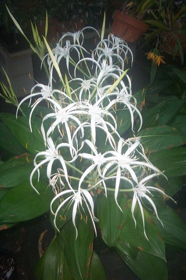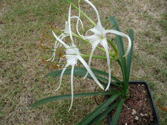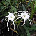 Hymenocallis sp. was originally on the mystery bulb page. Brad M wrote: "this variegated Hymenocallis has been grown in Australia for many years. It's rather tropical in its growth, and stunts in cold weather. I cannot decide if it's Lilium caribaea or Lilium littoralis. Do you know which one is more likely here?" Discussion centered around the lack of good information about the genus. One source from Australia thought it could be Lilium littoralis. Photos on the internet that may or may not be correctly identified show variegated leaves in both of those species.