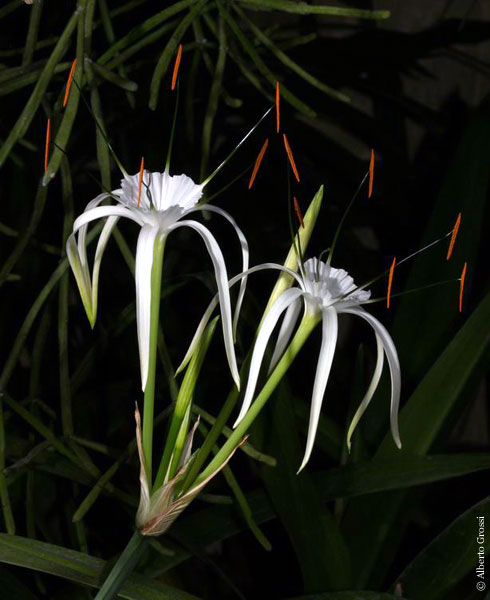 Hymenocallis littoralis (Jacq.) Salisb. is a vigorous evergreen species from Mexico and Guatemala which grows with its roots in the water during the warm growing season, making it a good garden subject in warm climates. It requires protection during cold winters. The lovely white flowers have long narrow reflexed petals behind a central cup. Several flowers are carried on each sturdy 70-90 cm stem. Photos by Bill Dijk and Alberto Grossi.