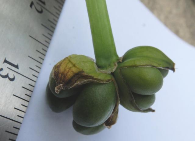 Hymenocallis maximillianii T.M.Howard (syn. Hymenocallis maximiliani T.M.Howard) is native to Mexico. It has compact, narrow, erect, foliage and gracefully proportioned flowers. Height range: to about 3 ft. Photos taken August 2005 by Jay Yourch. Seed photos by Rimmer de Vries; the first one shows a ruler marked in inches; plants flowered in early June in Michigan; seed pictured at the end of June.