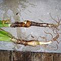 Hymenocallis sp., possibly Hymenocallis littoralis from Out Islands of Bahamas: 26 36' 13.76" N, 77 00' 37.17" W elev. 15' where it was growing on an active dune with up to 6" increase in dune height annually. Note extensions at bottom of the bulb. Out of almost 100 plants rescued from the ocean after hurricane Jeanne, most had these extensions or evidence that they had snapped off. It looks like the extension acts to keep the bulb near the surface as sand builds up on the dune. Interesting that the oldest section resembles a rhizome. Photos by Phil Andrews.