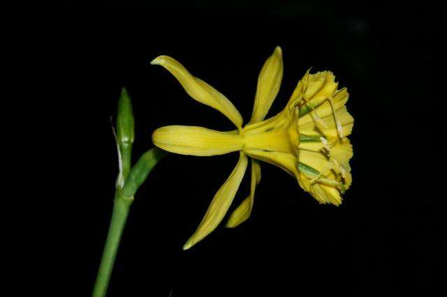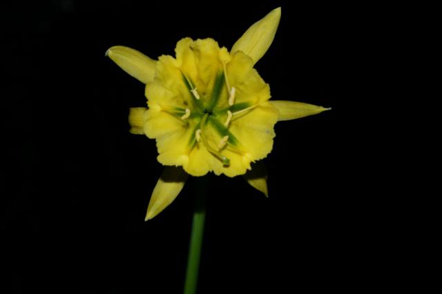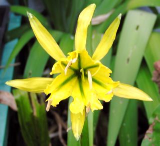 Ismene amancaes (Ruiz & Pav.) Herb. (syn. Hymenocallis amancaes (Ruiz & Pav.) G.Nicholson) is native to Peru. It has a bright yellow flower with a green striped staminal cup. In habitat, it flowers before the leaves appear. In the Bay Area, it flowers after the leaves appear in August. It is a summer-growing, winter-dormant species. During winter dormancy, keep the medium barely moist. Height range: 45-60 cm. Photo taken June 2006 by Lee Poulsen. Photos 2-6 were taken by Nhu Nguyen.