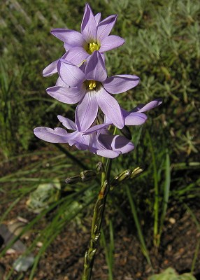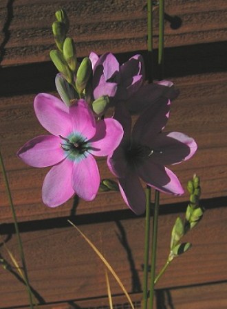What was left of the original Ixia rapunculoides (var. rapunculoides) is restricted to the western Karoo and has broad, falcate leathery leaves, a short perianth tube, and half nodding blue-mauve or pink flowers. Photos below were once felt to be this species. After the revision, we'd be safe to call them part of the complex. Height range: 30-55 cm. The first two photos were taken by Alan Horstmann. Photos 3-5 were taken by Mary Sue Ittner who wrote: It is one of the first ixias of the ones I grow in Northern California to flower which means that it is often in bloom during our wettest period and flower stalks that start out standing are soon bending over after it rains. The first two were taken during a brief dry period in January 2004. The last photo shows the corms.