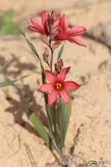 Ixia vinacea G.J.Lewis is found on stony clay flats in the Northwestern Cape. Growing from 40 to 45 cm high, it has red fowers with a dark center, three to nine per spike. It flowers August-September. Photos from iNaturalist taken by Ismail Ebrahim in September and November in the Western Cape and shared under a CC BY-NC license.