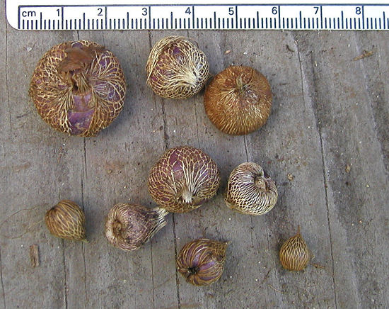 A flower dissection on a 1 mm grid, that same flower on its stem, the corms from which it grew and a white bloom from the same group of corms acquired from Jim Duggan, grown and photographed by M.Gastil-Buhl. These flowers have a faint fragrance when warm.