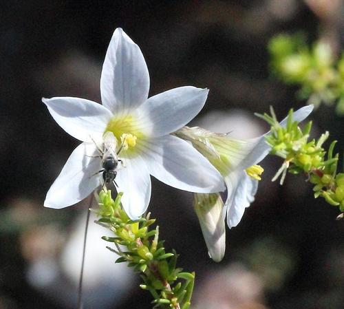 Ixia polystachya L. is found on flats, hills and mountain slopes over a wide range of the northwest and southwest Cape. It has pink, mauve, bluish, or white flowers, often, but not always, with a dark center. It has a fairly tall (up to 80 cm) and usually branched stem, but is variable in size, color, number of flowers, form (compact or lax), and leaf width. The first five photos were taken by Mary Sue Ittner. The last photo was taken by Cameron McMaster in the Overberg.