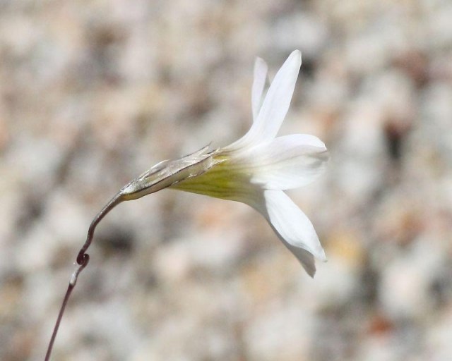Ixia sobolifera ssp. albiflora is restricted to the central Little Karoo. Growing from 40 to 65 cm, it has creamy white nodding flowers with a pale yellow cup, sometimes flushed grey-mauve, 4 to 5 on the main spike. Flowers are intensely carnation-scented and occur from August to mid September, more commonly in a wet year. Photo from the book Plants of the Klein Karoo courtesy of Jan and Anne Lise Schutte-Vlok.