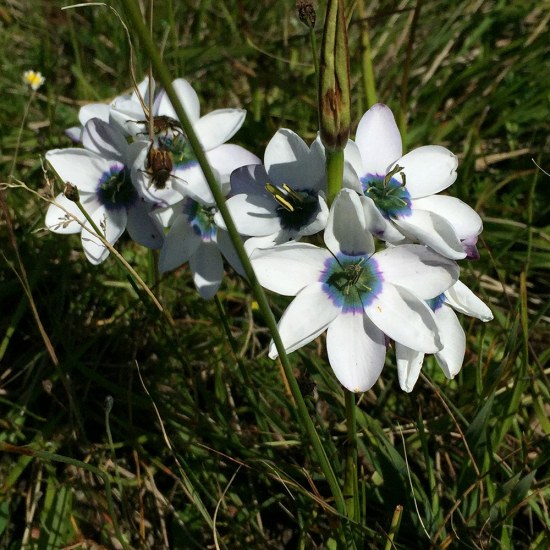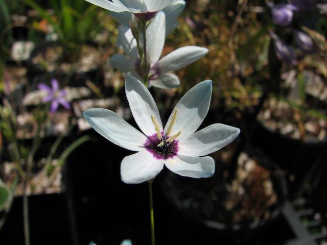 Ixia versicolor G.J.Lewis grows on sandy flats in the Southwest Cape. It has white or purple flowers with a dark center and exserted stamens, and grows 15-35 cm high. The first photo from Rod Saunders. The next photos from iNaturalist were taken by Carina Lochner in September in the Southwestern Cape and shared under a CC BY-NC license.