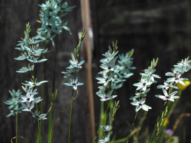 Ixia sobolifera ssp. sobolifera occurs in the Little Karoo, the Roggeveld and nearby. It has slate-blue or grey-blue faintly scented flowers with a white cup, and uniformly yellow anthers with the style reaching or exceeding the anther tips. Photo from iNaturalist taken by Marion Maclean in the Little Karoo in July and shared under a CC BY-NC license