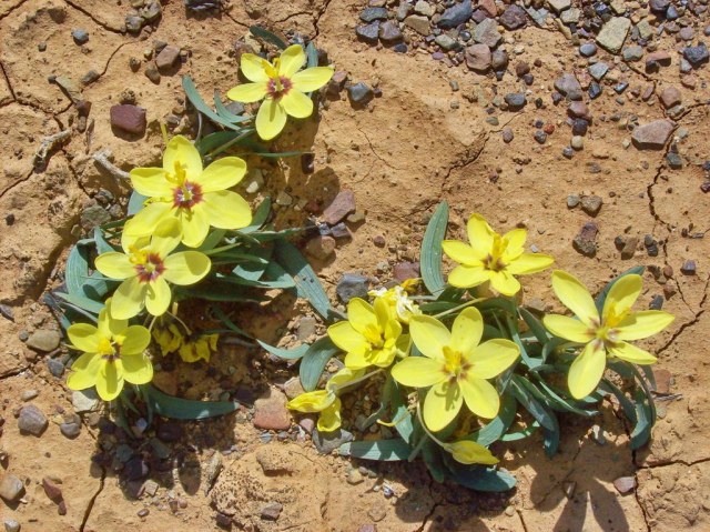 Ixia macrocarpa Goldblatt & J.C.Manning is known from a single population near Loeriesfontein, Northern Cape where it grows on stony, shale flats in fine-grained clay soils. It was discovered in 2014. It has falcate leaves and long-tubed pale yellow flowers with dark markings. It is one of only two acaulescent species. Height range: 3-5 cm. Photos from iNaturalist were taken by Richard Adcock and shared under a CC BY-NC license.