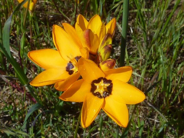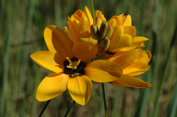 Ixia maculata L. is found on granite and sandstone flats and slopes in the northwest and southwest Cape. It has orange to yellow flowers with a dark central ring and star-like center. Height range: 20-50 cm. It grows well in the ground in Northern California where it blooms in March or April. The first three photos of garden plants are by Mary Sue Ittner. The fourth is by Michael Mace. The last two photos are from Nick de Rothschild who wondered if the pendulous plant was Ixia maculata or not. The last photo was added of an upright form for comparison. There was no conclusion although a number of people mentioned that ixias that are rained on often fall over.